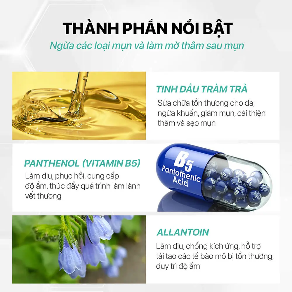 ✿ Tea Tree Oil (tinh dầu Tràm trà nano): Kháng khuẩn, kháng viêm, giúp hỗ trợ điều trị mụn trứng cá, giảm viêm mụn sưng đỏ.